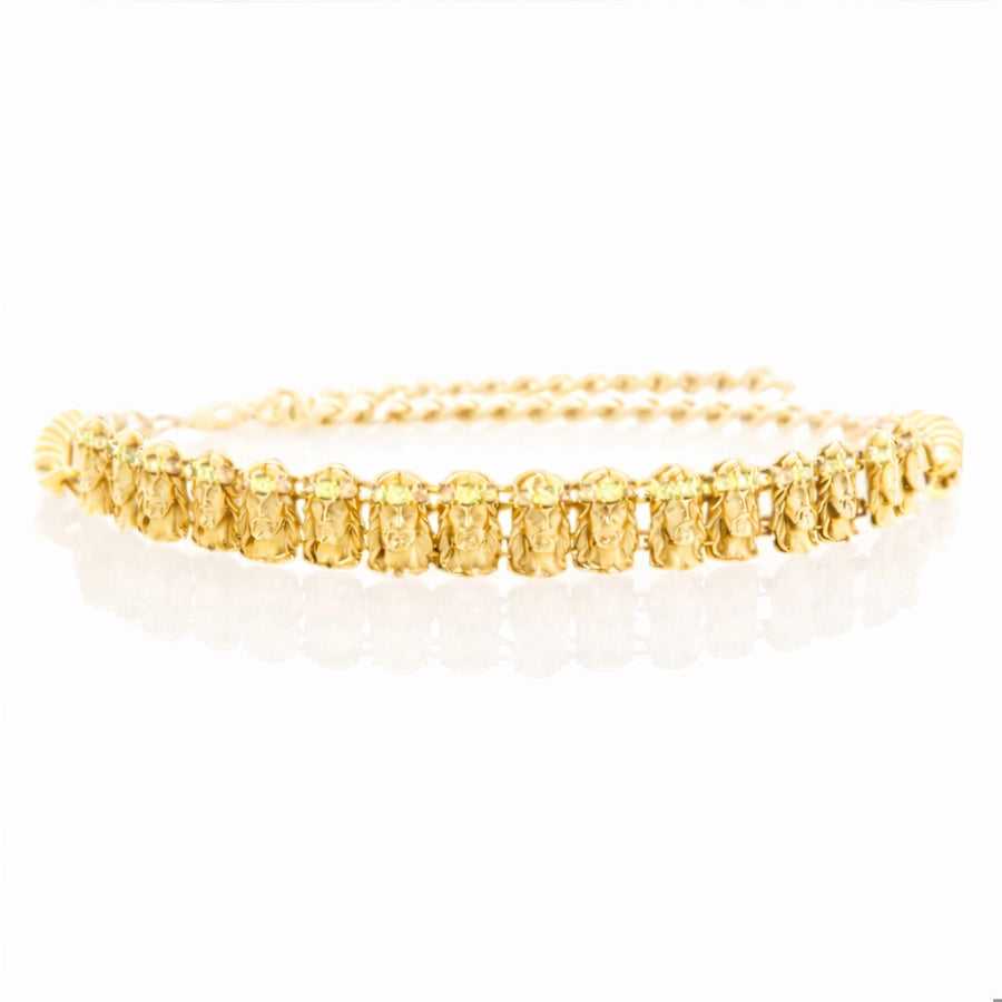 Stainless steel with 14k plating, hypoallergenic snap closure, hand woven with leather