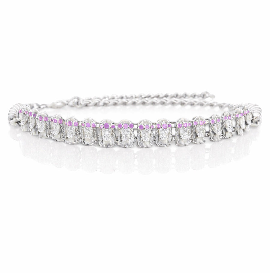 Stainless steel with 14k plating, hypoallergenic snap closure, hand woven with metallic leather